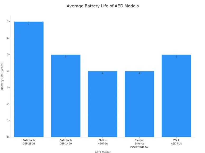 คุณวางใจเครื่องกระตุกหัวใจไฟฟ้าอัตโนมัติภายนอกเพื่อให้การดูแลหัวใจได้อย่างรวดเร็วและมีประสิทธิภาพในภาวะฉุกเฉิน อายุการใช้งานแบตเตอรี่ถือเป็นปัจจัยสำคัญในเทคโนโลยีเครื่องกระตุกหัวใจไฟฟ้า แบตเตอรี่ลิเธียมสมัยใหม่สามารถจ่ายพลังงานให้กับเครื่องกระตุกหัวใจไฟฟ้ารุ่นต่างๆ ได้นานถึง 7 ปี ซึ่งถือเป็นการพัฒนาที่สำคัญเมื่อเทียบกับรุ่นก่อนหน้า ยกตัวอย่างเช่น Defibtech DBP-2800 มีอายุการใช้งานแบตเตอรี่สูงสุด 7 ปี ในขณะที่รุ่นเก่าอย่าง Philips M5070A และ Cardiac Science Powerheart G3 มักมีอายุการใช้งานประมาณ 4 ปี ความก้าวหน้าด้านเคมีของแบตเตอรี่นี้ช่วยให้เครื่องกระตุกหัวใจไฟฟ้าของคุณพร้อมรับมือกับภาวะหัวใจหยุดเต้นเฉียบพลัน